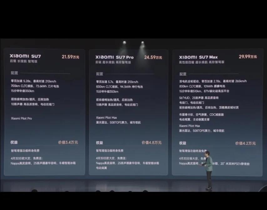雷军对小米SU7和特斯拉Model3进行了详尽的比较。小米SU7在续航能力和智能驾驶上稍显不足,但在外观设计和车身尺寸上表现突出。价格方面,小米SU7的标准版为21.59万,Pro版为24.59万,MAX版则是29.99万,比特斯拉Model3便宜了好几万元。而且,在4月30日之前预订,消费者还能享受到电冰箱、彩电、真皮沙发等赠品。购车时,性价比是消费者最关心的问题,小米SU7的性价比确实很有吸引力。