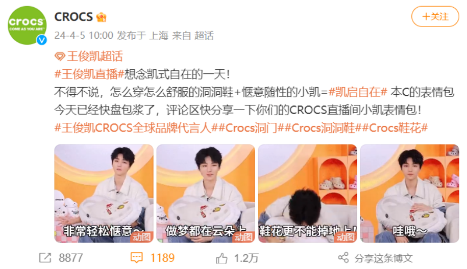 CROCS不再仅仅是一个品牌,它已经融入了年轻人的生活。在社交媒体上,“洞门文学”红极一时,其热度甚至能与“疯四文学”和“麦门文学”相媲美。许多年轻人会分享穿着CROCS的穿搭日记,记录下穿着它游玩、上班等时刻,同时还会推荐各种搭配的小饰品,让更多的人对这个品牌有了认识,并对其产生了兴趣。