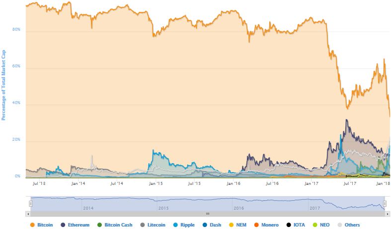 原本约定的是全新的货币体系,然而后来却变成了用法定货币购买后进行炒币的全球赌局。从 2016 年末开始,一直持续到 2018 年 1 月 8 日。在整个市场中,除了比特币之外的数字“货币”的总值,从 22.5891 亿美元增长到了将近 5483.57 亿美元。市场整体的币值以及交易量的增幅都非常惊人。