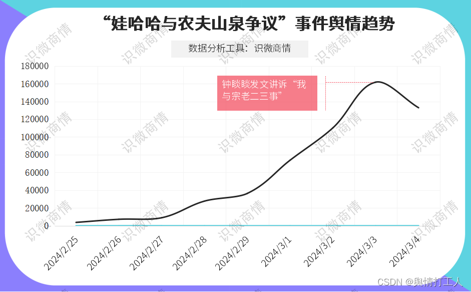 在2024年2月25日至3月4日15时,我们分析了识微商情舆情监测系统的数据,发现有关娃哈哈和农夫山泉的争议事件在网络上引发了约56.1万条讨论。从25日开始,讨论量不断上升,到了3月3日,钟睒睒发表言论时,话题热度达到最高点。娃哈哈的创始人去世后,受到了广泛的关注。农夫山泉的品牌形象和争议的发展趋势与娃哈哈相似。在争议爆发之前,网上对其好评的比例达到了49%,然而,在钟睒睒作出回应后,好评比例降至37%,这表明公众对他的回应持有疑虑。