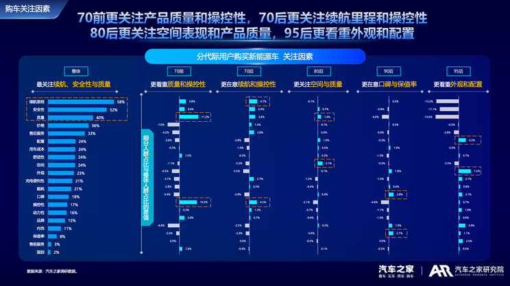 不同年龄段的人对新能源汽车的关注点各有不同。年纪较大的,比如七十岁以上的,他们更重视车辆的质量和操控体验,因为他们驾驶经验丰富,对转向、悬挂等传统机械性能的可靠性及操控性特别看重,比如在一些老工业基地的叔叔们。而七十年代出生的人,他们更关心车辆的续航力和操控性能。对于北京、上海等城市中通勤距离较远的居民,他们需要车辆具备较强的续航能力。到了八十年代出生的人群,他们更注重车辆的空间表现和产品质量,因为他们大多已经成家立业,家庭人口较多,对空间的需求较大,就像很多二三线城市的大家庭。而九五后这一代,他们更看重车辆的外观设计和配置,这些年轻人喜欢在时尚的都市中心展示自己的爱车,追求个性鲜明的外观和高端的配置。